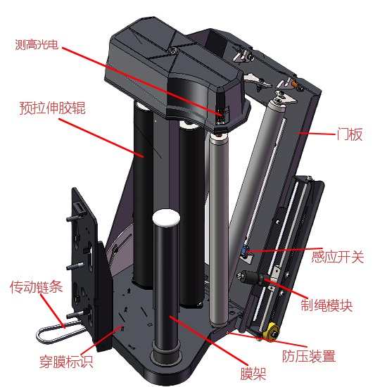 首先,膜座由膜架、導(dǎo)向輥柱、預(yù)拉伸膠輥、測(cè)高光電、傳動(dòng)鏈條、制繩模塊以及防壓裝置等部分組成。在我們使用時(shí),先打開(kāi)門(mén)板將專(zhuān)用的機(jī)用膜放在膜架上,將薄膜按指定路線繞膜,然后將膜座門(mén)體輕推閉合即可,薄膜更換操作便捷。導(dǎo)向輥柱隨薄膜拉膜方向貼俯在預(yù)拉伸膠輥上,對(duì)薄膜按一定比例進(jìn)行拉伸,壓力感應(yīng)輥筒隨纏繞膜壓合在壓力傳感器上,壓力值的變化直接驅(qū)動(dòng)膜座電機(jī)的放膜速度,從而改善產(chǎn)品四周纏繞膜的收縮力,最終提高打包纏繞的品質(zhì)和效率。在運(yùn)行時(shí),測(cè)高光電將自動(dòng)感應(yīng)貨物高度,當(dāng)纏繞至貨物頂部時(shí),發(fā)送信號(hào)給到PLC,然后膜座停止上升。